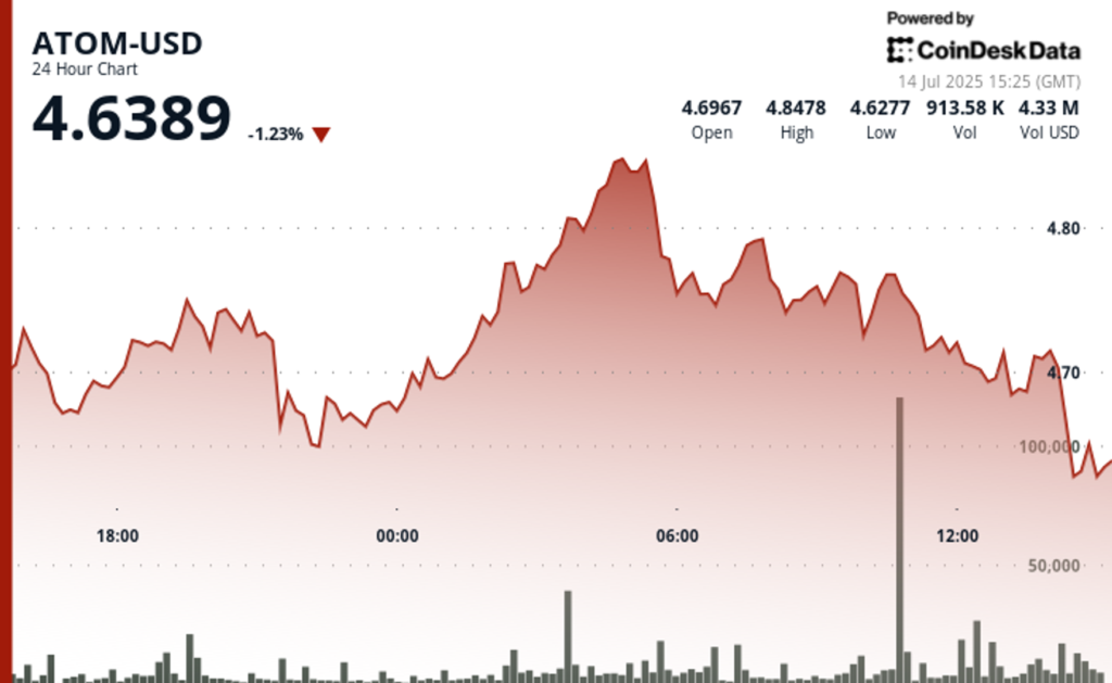 ATOM traded within volatile range between $4.64 and $4.85 on Monday.
