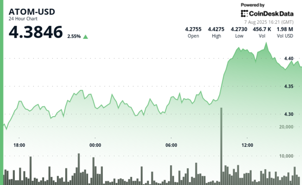 ATOM delivers strong bullish momentum over 23 hours from August 6 15:00 to August 7 14:00. Price surges from $4.26 to $4.41, posting 3.40% gain with $0.18 range.Token establishes critical support at $4.29. High-volume confirmation during multiple retests.Resistance emerges at $4.34 before decisive break at 10:00 session. Volume hits exceptional 1,695,921 units.Breakout above $4.34 resistance backed by volume exceeding 24-hour average of 674,298 units.Technical structure stays constructive. Higher lows pattern intact. Momentum indicators support further upside.Breakout targets $4.43 Fibonacci extension level.