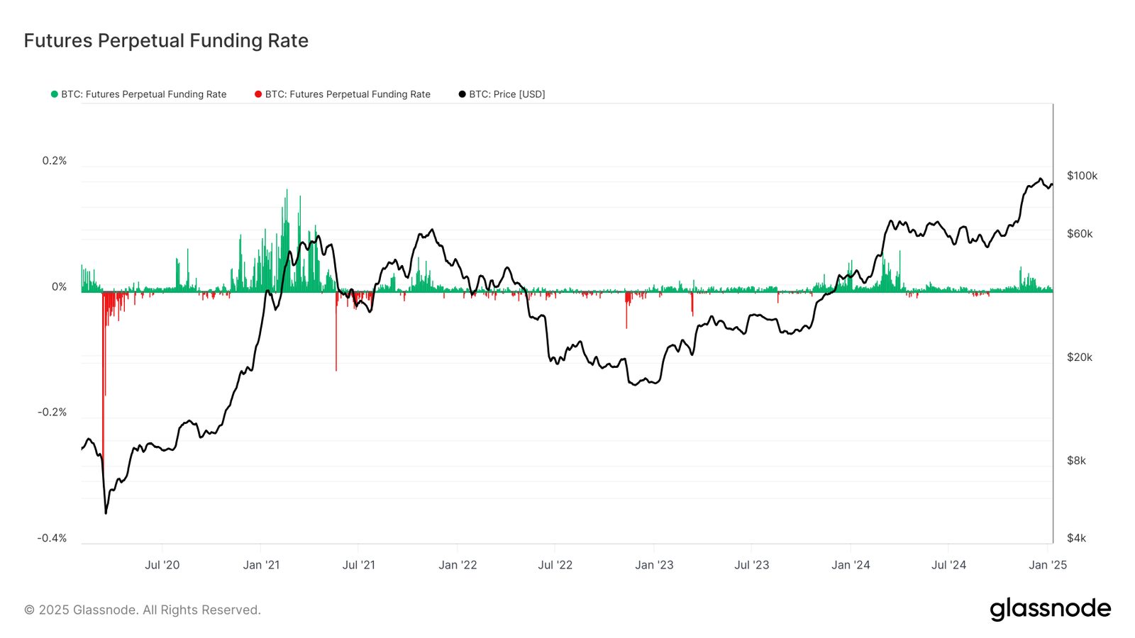 One metric that traders keenly observe is the futures perpetual funding rate. This is defined as the average funding rate (in %) set by exchanges for perpetual futures contracts. When the rate is positive, long positions periodically pay short positions. Conversely, when the rate is negative, short positions periodically pay long positions.