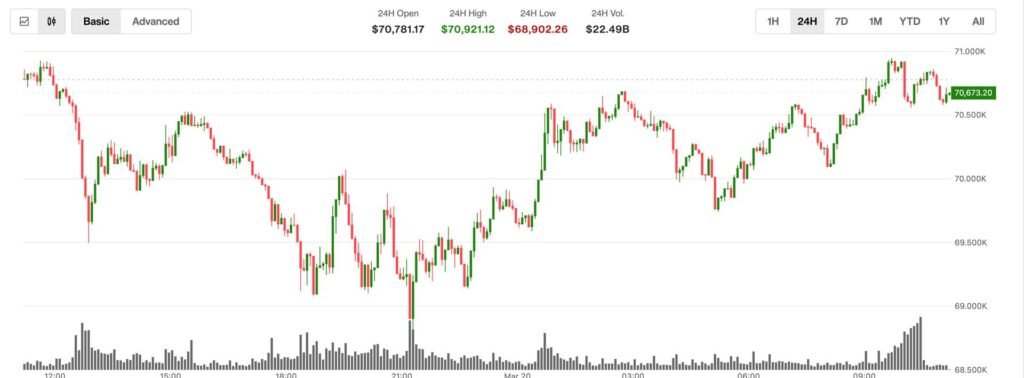 Bitcoin jumps to $70,800 as oil retreats; ether and XRP lag