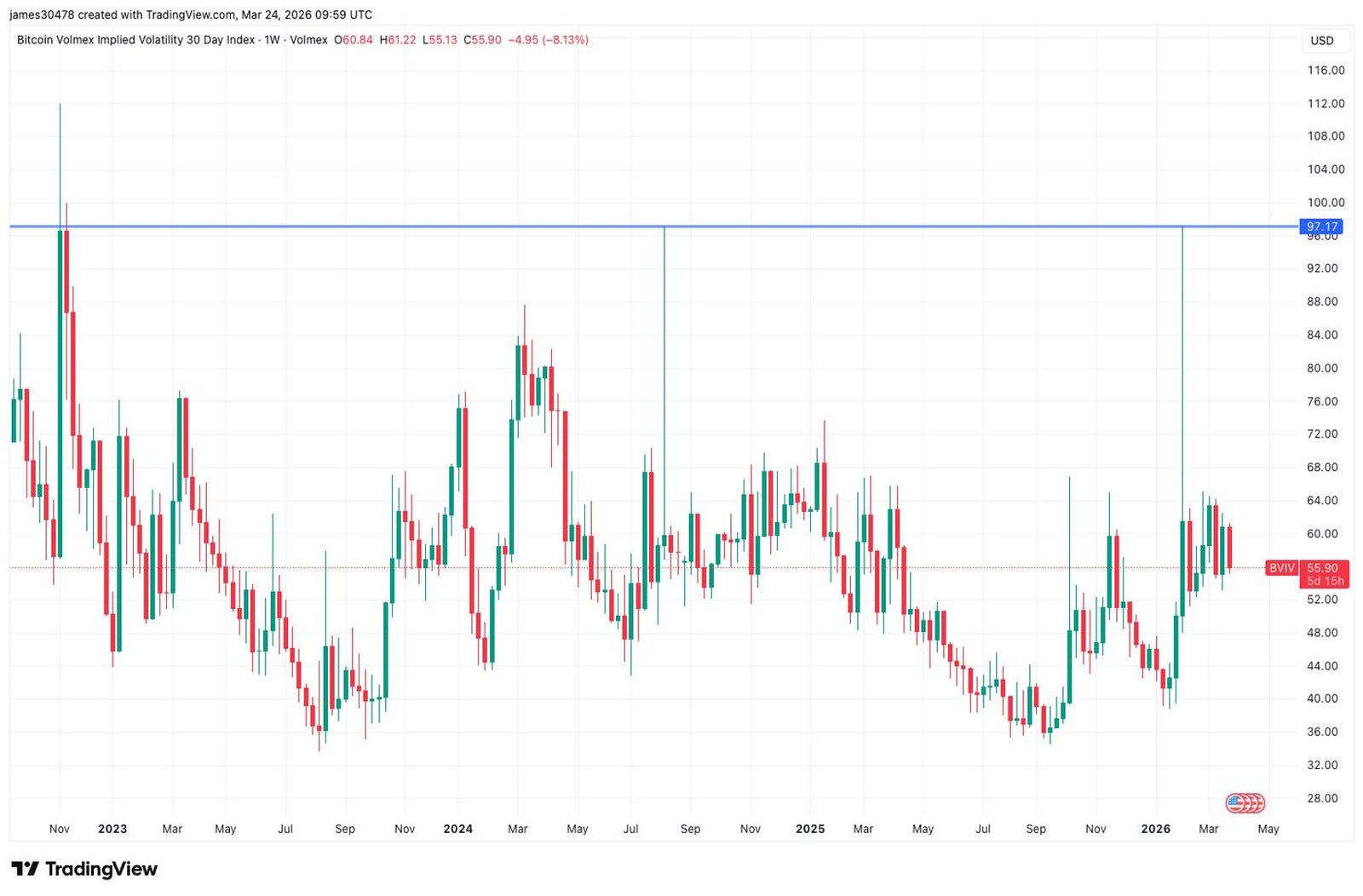 Implied volatility indicators DVOL and BVIV suggest peak fear has passed, with crypto leading traditional markets in pricing risk.