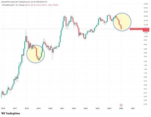 The bitcoin-to-gold ratio rebounded from recent lows, mirroring a pattern seen in the 2019-2020.