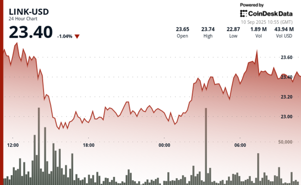 Trading Performance: LINK posted a modest 1% decline over the 24-hour period, experiencing volatile intraday swings of 7% between $22.84 and $24.46, CoinDesk Research’s technical analysis model showed.Volume Indicators: Trading activity spiked to 3.78 million units at 14:00 on September 9:00 UTC, exceeding the 24-hour average and establishing support near the $23 price level.Resistance Testing: The intraday high of $23.49 encountered selling pressure before declining through minor support levels, indicating profit-taking activity and potential preparation for additional downside price discovery.