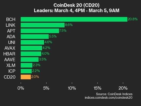 CoinDesk 20 Performance Update: Bitcoin Cash (BCH) Drops 2.8%, Leading Index Lower