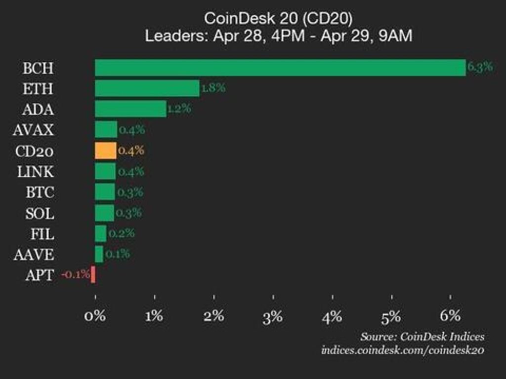 CoinDesk 20 Performance Update: Bitcoin Cash (BCH) Gains 6.3% as Index Trades Higher
