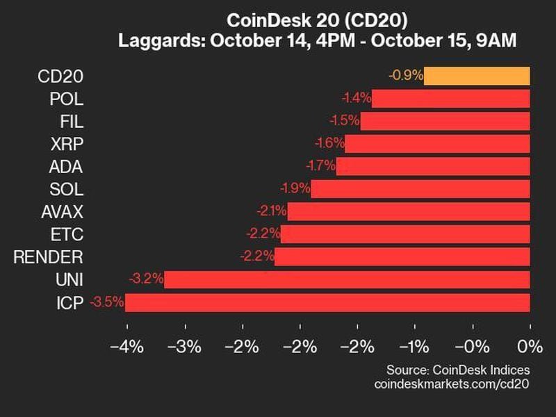 CoinDesk Indices presents its daily market update, highlighting the performance of leaders and laggards in the CoinDesk 20 Index.