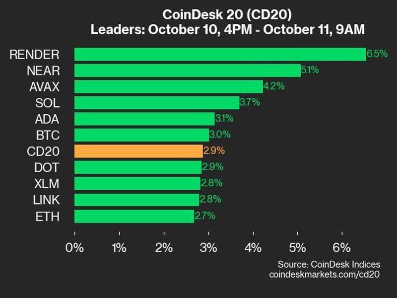 Leaders: RENDER (+6.5%) and NEAR (+5.1%).