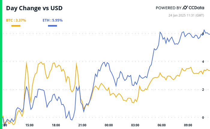 BTC is up 2 % from 4 p.m. ET Thursday to $105,450.57 (24hrs: +3.43%)
