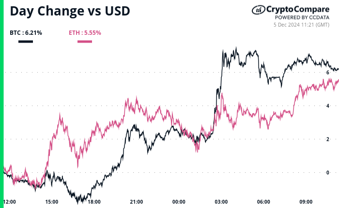 The market looks overheated and faces pullback risks, with BTC’s perpetual funding rates more expensive than those of speculative tokens such as DOGE.Traders are increasingly focusing on ETH, as evidenced by the new high of 6.86 million ETH in ether futures and perpetual futures open interest. BTC’s OI is yet to confirm the new spot-price high.BTC calls, however, are more expensive than ETH on Deribit, according to 24-delta risk reversals sourced from Amberdata. Long dealer gamma at the $105,000 strike options suggests potential for range play.BTC, ETH options flows mostly leaned bullish, but a large block trade saw an ETH trader sell the December expiry straddle at $3,800, collecting over $2 million in premium. Selling straddle represents expectations for price consolidation and volatility drop.BTC is up 4.83% from 4 p.m. ET Wednesday to $102,565.99 (24hrs: +6.22%)ETH is up 2.36% at $3,935.20 (24hrs: +5.24%)CoinDesk 20 is up 1.4% to 3,956.08 (24hrs: +0.21%)Ether staking yield is down 19 bps to 3.27%BTC funding rate is at 0.045% (49.3% annualized) on BinanceDXY is down 0.11% at 106.21Gold is up 0.69% at $2672.20/ozSilver is up 1.14% to $31.86/ozNikkei 225 closed +0.3% at 39,395.60Hang Seng closed -0.92% at 19,560.44FTSE is unchanged at 8339.32Euro Stoxx 50 is up 0.54% at 4,945.57DJIA closed on Wednesday +0.69% to 45,014.04S&P 500 closed +0.61% at 6086.49Nasdaq closed +1.3% at 19,735.12S&P/TSX Composite Index closed unchanged at 25,641.2S&P 40 Latin America closed +0.38% at 2,336.15U.S. 10-year Treasury was unchanged at 4.205%E-mini S&P 500 futures are unchanged at 6094.50E-mini Nasdaq-100 futures are down 0.14% to 21,505.75E-mini Dow Jones Industrial Average Index futures are unchanged at 45,069.BTC Dominance: 56.60% (-0.61%)Ethereum to bitcoin ratio: 0.03800 (1.78%)Hashrate (seven-day moving average): 741 EH/sHashprice (spot): $61.12Total Fees: 14.8 BTC/ $1.4 millionCME Futures Open Interest: 188,135 BTCBTC priced in gold: 39.0 ozBTC vs gold market cap: 11.12%Bitcoin sitting in over-the-counter desk balances: 423,913The chart shows bitcoin’s Mayer multiple, which measures the difference between an asset’s going market value and its 200-day simple moving average (SMA).As of writing, the Mayer multiple stands well below the 2.4 threshold that has marked previous bull market tops. MicroStrategy (MSTR): closed on Wednesday at $406 (+8.72%), up 6.38% at $431.90 in pre-market.Coinbase Global (COIN): closed at $330.94 (+6.98%), up 3.04% at $341.01 in pre-market.Galaxy Digital Holdings (GLXY): closed at C$27.71 (+6.2+5%)MARA Holdings (MARA): closed at $25.96 (+3.3%), up 5.51% at $27.39 in pre-market.Riot Platforms (RIOT): closed at $12.95 (+6.67%), up 4.72% at $13.56 in pre-market.Core Scientific (CORZ): closed at $17.47 (+6.39%), up 2.63% at $17.93 in pre-market.CleanSpark (CLSK): closed at $14.68 (+5.23%), up 3.47% at $15.19 in pre-market.CoinShares Valkyrie Bitcoin Miners ETF (WGMI): closed at $29.52 (+7.11%), up 3.15% at $30.45 in pre-market.Semler Scientific (SMLR): closed at $63.40 (-0.36%), up 7.37% at $68.07 in pre-market.