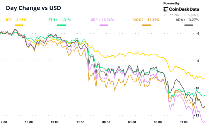 The crypto market is a sea of red, with bitcoin trading at three-month lows under $88,000 and the CoinDesk 20 Index down more than 10% in 24 hours. There are several catalysts for the swoon, including risk-off sentiment in traditional markets and influence from memecoins, especially the recent trading in TRUMP and LIBRA.