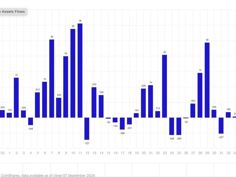 Bitcoin fell more than 8% during the week, closing out Friday at $54,000 having traded around $59,000 on Sept. 2. The period was a busy one for economic data out of the U.S., with all of the readings – including the widely watched nonfarm payrolls report – coming in weak. While that raised the prospects of a 50 basis-point rate cut by the Fed this month, it did little to stir bitcoin bulls.