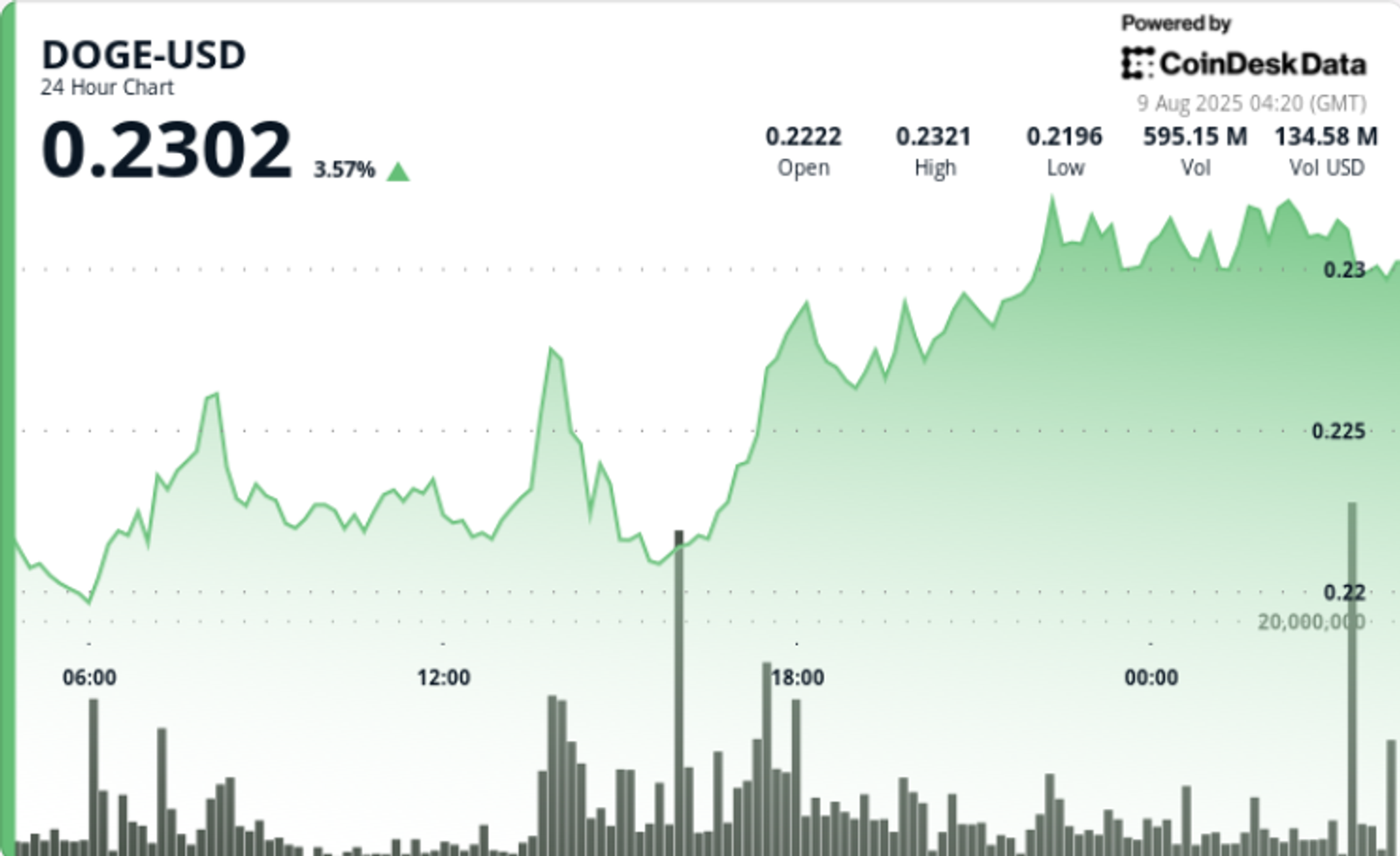 DOGE rises 4% in the 24-hour period ending August 9, climbing from $0.22 to $0.23 between August 8 04:00 and August 9 03:00. The move spans a $0.01 range, marking 5% volatility.