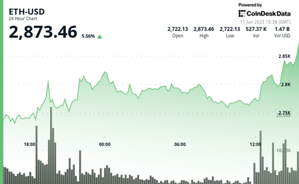 Against that macro backdrop, ether vaulted from the upper-$2,780s to an intraday high of $2,873.46, with spot volume swelling to roughly 527,000 coins (~$1.47 billion), according to CoinDesk Research’s technical analysis model.