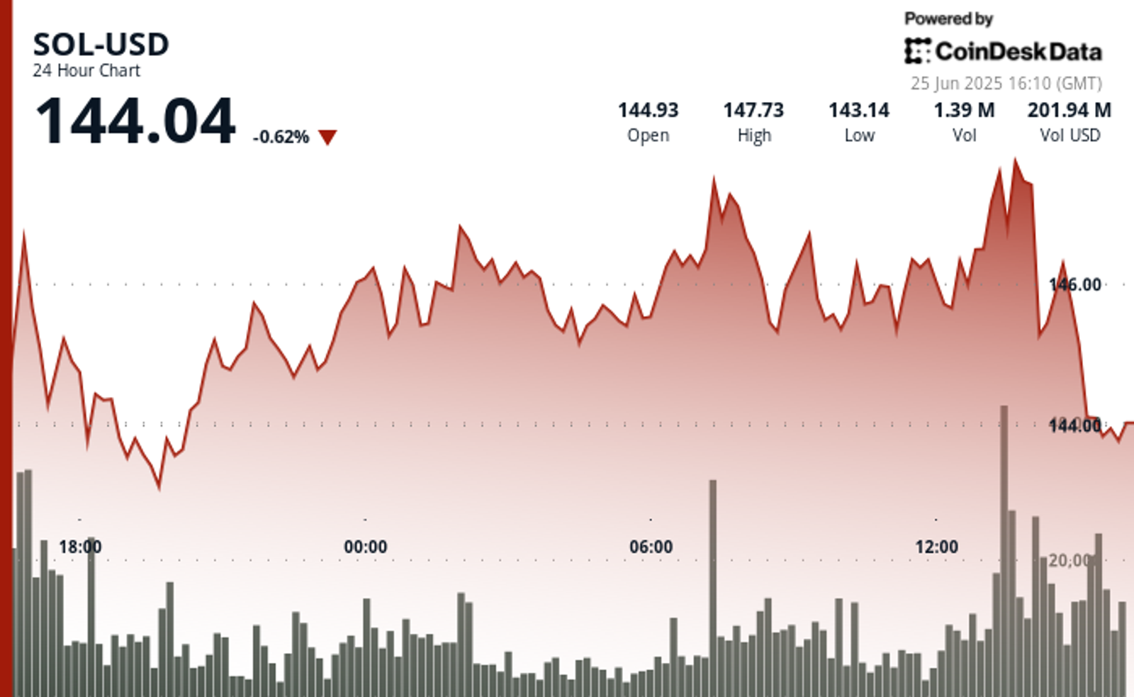 Solana’s SOL SOL token is trading at $144.04, down 0.62% in the past 24 hours, after briefly climbing as high as $147.73 earlier in the session, according to CoinDesk Research’s technical analysis model.