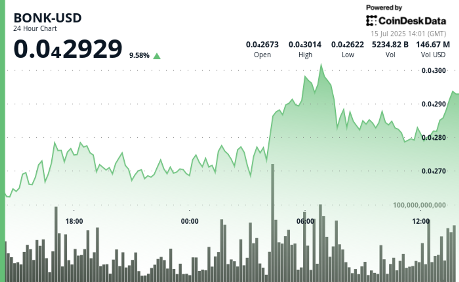 BONK rallied 15% to $0.000031 (July 14 13:00–July 15 12:00 UTC).Trading volume topped 3.5 trillion tokens during the 06:00–07:00 UTC breakout phase.Open interest surged 9%, while derivatives activity spiked sharply.A planned 1 trillion BONK token burn introduces a deflationary catalyst.Price consolidated at $0.000028 following the rally; support held at $0.000026BONK spiked 2% in minutes at 12:30 UTC on 75 billion tokens exchanged.Current price: $0.0000294, with daily gains of 7.8% and bullish structure intact.