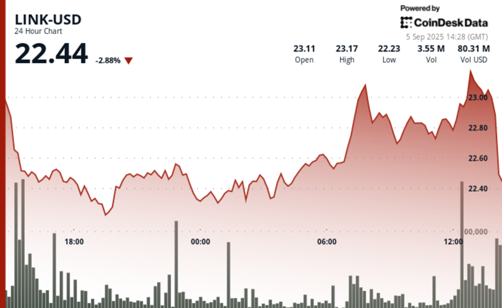 The token slid another 2.8% over the past 24 hours to $22.4 while the broader market, as measured by the CoinDesk 20 Index was little changed, CoinDesk data shows. It’s trading 15% lower since topping $27 on Aug. 22, despite being tapped by the U.S. government to publish economic data on the blockchain and Bitwise filing for a LINK exchange-traded fund (ETF).