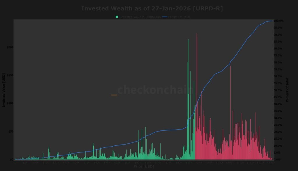 Most invested bitcoin supply sits above current prices, increasing price vulnerability if key support levels fail.