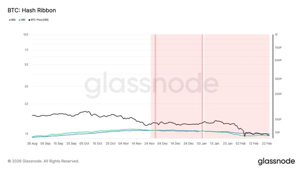 Hash Ribbon recovery and sub production pricing suggest the worst of the bitcoin drawdown may have passed.