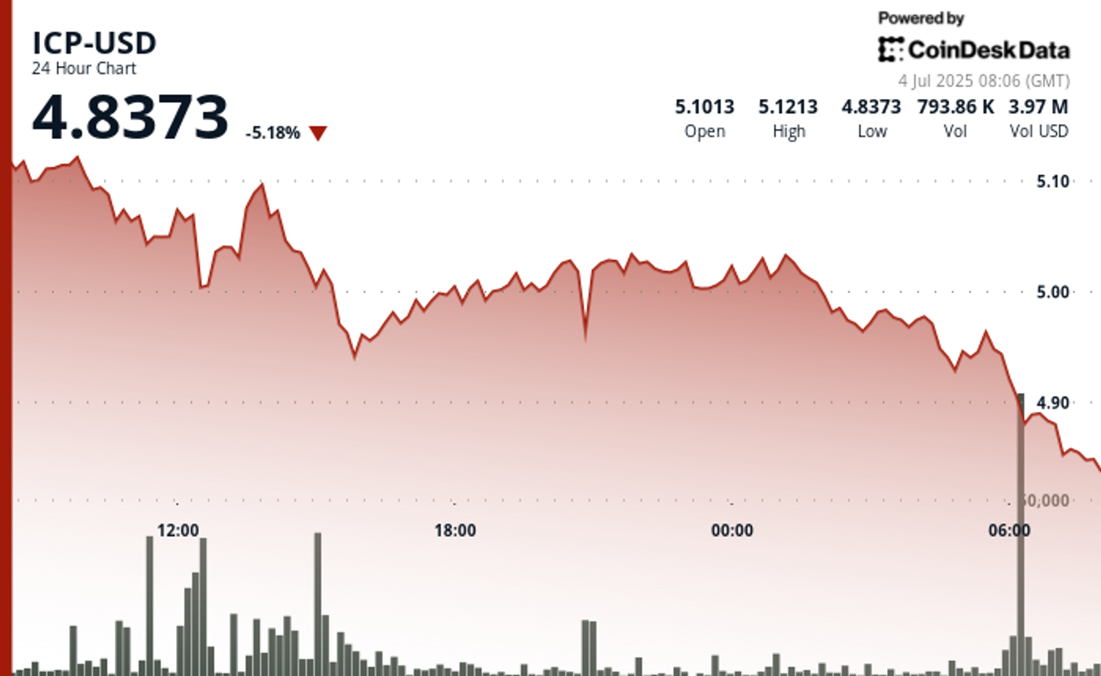 ICP’s price reaction was swift, with the token falling through key support at $5.00, according to CoinDesk Research’s technical analysis model. The bearish move was amplified by increased trading volumes during key selloffs at 12:00 and 20:00 UTC on July 3. The coin’s vulnerability to broader risk sentiment was on full display, as the cyber threat narrative intersected with elevated volatility to push prices sharply lower.