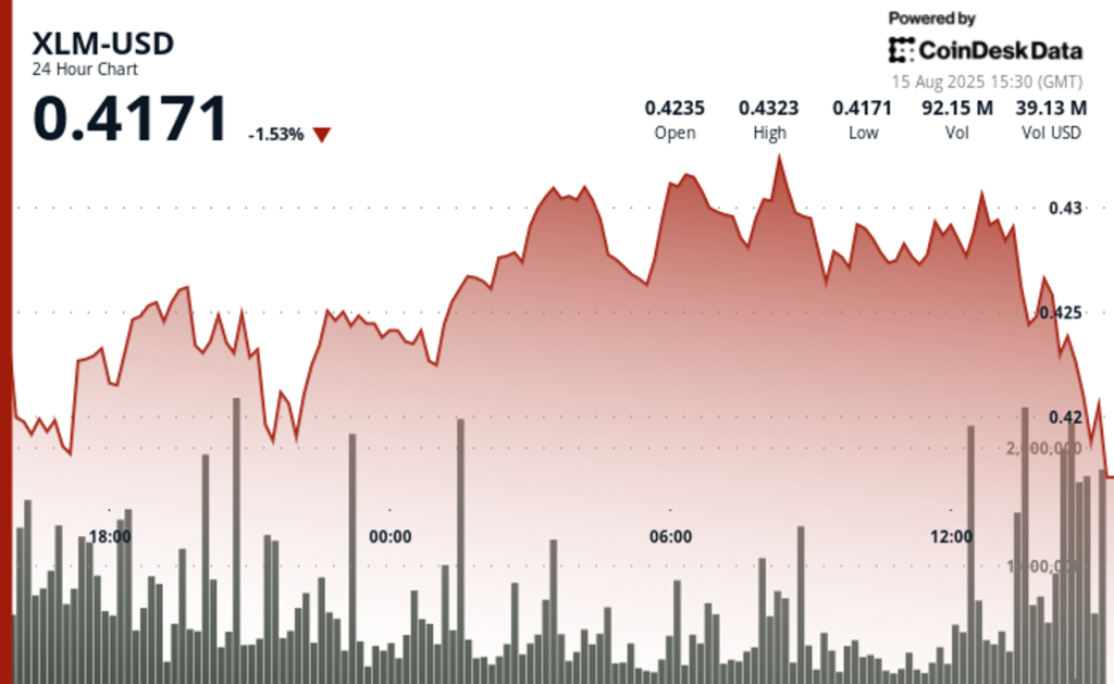Stellar lumens (XLM) traded in a tight range over the past 24 hours, holding between $0.42 and $0.43 from Aug. 14 at 15:00 UTC through Aug. 15 at 14:00 UTC.