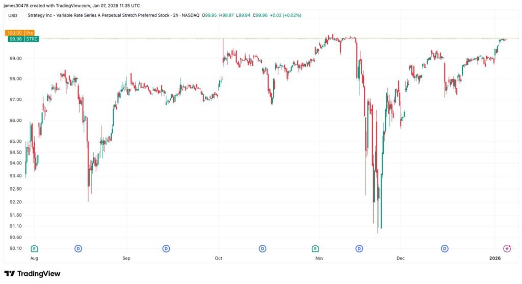 The bitcoin treasury company's perpetual preferred equity, STRC, hit $100 for the first time since early November.