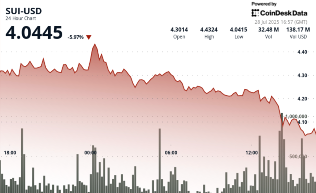 SUI, the native token of the Sui blockchain, is down nearly 6% over the past 24 hours, retreating to $4.04 after briefly jumping to $4.44 overnight. The move came on the back of a 32.37 million token volume spike, well above daily norms, before selling intensified and dragged prices lower, CoinDesk Analytics data shows.