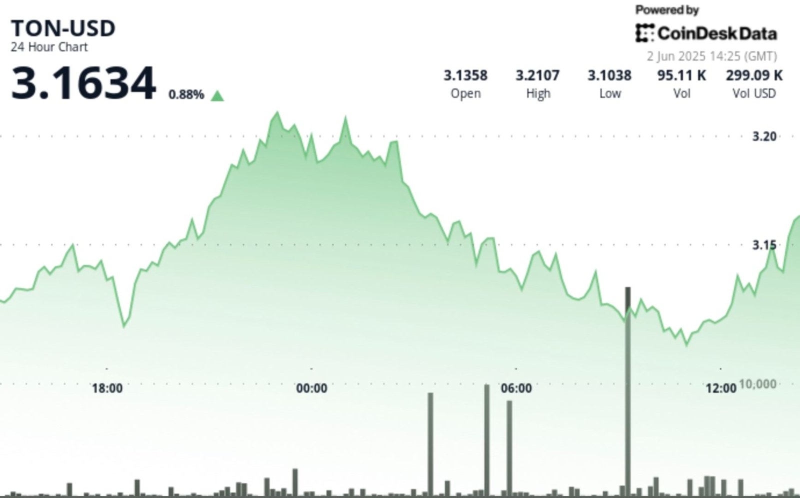 • In the last hour, TON-USD surged from $3.12 to $3.15, representing a 1.8% gain.