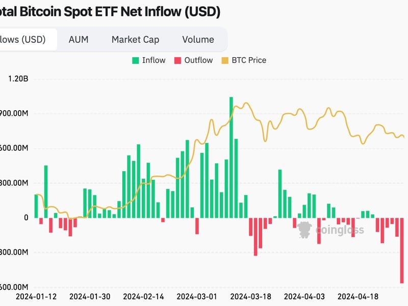 The 11 ETFs saw a cumulative net outflow of $563.7 million, the largest since the funds began trading on January 11, extending a five-day losing streak, according to data source Farside Investors and CoinGlass. Investors have pulled out nearly $1.2 billion from the ETFs since April 24.