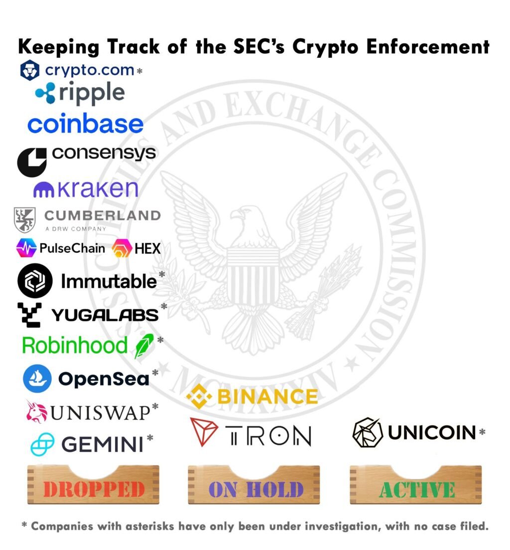 Ripple: Ripple announced it had reached an agreement with the SEC to drop both the SEC’s appeal of a federal judge’s 2023 ruling and RIpple’s cross-appeal. Ripple will receive back $75 million of the $125 million fine it was assessed by a federal judge. The agreement does not yet appear to be on the public court docket.Coinbase: Coinbase announced last month it had reached an agreement with the SEC to drop the regulator’s ongoing case against it. The SEC filed to withdraw the case with prejudice — meaning it cannot bring the same charges again — and a judge signed off on the withdrawal at the end of February. The SEC alleged that Solana (SOL), Cardano (ADA), Polygon (MATIC), Sandbox (SAND), Filecoin (FIL), Axie Infinity (AXS), Chiliz (CHZ), Flow (FLOW), Internet Computer (ICP), Near (NEAR), Voyager (VGX), Dash (DASH) and Nexo (NEXO) all appeared to be traded as securities in its initial lawsuit.ConsenSys: The SEC said it would drop its case against ConsenSys over the MetaMask wallet, CEO Joe Lubin said last month, and a joint stipulation dismissing the case with prejudice was filed on March 27. A court docket entry dated March 28 said the civil case was terminated.Kraken: The SEC told Kraken it would drop its case against the exchange alleging it violated securities laws and commingled customer and corporate funds earlier this month. A joint stipulation dismissing the case was filed on March 27, though a judge does not appear to have signed off just yet.Cumberland DRW: The SEC told Cumberland DRW it would drop its case alleging it was acting as an unregistered securities dealer earlier this month. The SEC and Cumberland filed a motion to stay proceedings on March 18, saying “the parties have agreed in principle to dismiss this litigation with prejudice” but needed three weeks to work out the details. The judge overseeing the case granted the motion, ordering the parties to file a joint status report by April 8 unless the dismissal filing is on the docket by then.Pulsechain: A federal judge dismissed the SEC’s suit against Pulsechain and HEX, saying the agency did not plausibly show that the project targeted U.S. investors and that it had jurisdiction over the case. The SEC has until April 21 to file an amended complaint.Immutable: The SEC told Immutable Labs it closed its investigation into the Web3 gaming firm, it said earlier this week.Yuga Labs: The SEC closed its investigation into Yuga Labs, the NFT firm said earlier this month.Robinhood: The SEC told trading platform Robinhood it closed its investigation into the company, it said late last month.OpenSea: The SEC closed its investigation into OpenSea, the NFT marketplace’s CEO said late last month.Uniswap: The SEC closed its investigation into Uniswap Labs, the firm announced last month.Gemini: The SEC closed its investigation into Gemini, co-founder Cameron Winklevoss said last month.Binance: The SEC and Binance (alongside the various affiliated parties/co-defendants) filed to pause the regulator’s case for 60 days in early February. The judge overseeing the case paused the case until April 14, ordering the parties to file a joint status report by then. The SEC alleged commingling violations alongside securities law violations, as well as allowing U.S. persons to trade on the global platform.Tron Foundation: The SEC and the Tron Foundation (alongside the various affiliated parties/co-defendants named) filed to pause the SEC’s case for 60 days in late February. The judge overseeing the case granted the motion, which should bring the new deadline to around April 27 (a Sunday). The SEC alleged market manipulation and fraud, alongside securities law-related registration violations.Crypto.com: Crypto.com announced on March 27 that the SEC had closed its case into the crypto exchange and would not take any enforcement action. Trump Media, the company behind Truth Social, is also partnering with the exchange to issue exchange-traded products.Unicoin: Unicoin appears to be the only publicly-disclosed ongoing investigation by the SEC, though its CEO has asked the agency to close that investigation as well.HAWK: On Thursday, Haliey Welch, whose “HAWK” token appeared to pump and dump (falling from a $491 million market cap to under $100 million within minutes) when it launched last year, told TMZ that the SEC had closed its investigation into her as well.Trump-Backed World Liberty Financial Confirms Dollar Stablecoin Plans With BitGo: World Liberty Financial is launching USD1, a stablecoin, on the Ethereum and BNB Chain networks.Trump Media Wants to Partner with Crypto.Com for ETP Issuance: Trump Media, the company behind the Truth Social social network, wants to launch crypto exchange-traded products with Crypto.com.U.S. House Stablecoin Bill Poised to Go Public, Lawmaker Atop Crypto Panel Says: The House’s latest stablecoin bill draft more closely aligns with the Senate’s GENIUS Bill, which passed out of committee already, Rep. Bryan Steil said at the Digital Chamber’s annual conference.Trump-Tied World Liberty Financial Pitches Its Stablecoin in Washington With Don Jr.: Donald Trump Jr. and other World Liberty Financial leaders promoted its new stablecoin at the Chamber event.SEC Drops Investigation into Web3 Gaming Firm Immutable: The U.S. Securities and Exchange Commission has dropped another investigation, this time into Immutable.Shuttered Russian Crypto Exchange Garantex Rebrands as Grinex, Global Ledger Finds: Garantex is an exchange sanctioned by the U.S. and seized by international law enforcement officials. That does not appear to have stopped some of its operators from rebranding it as Grinex and launching anew, based on on-chain and off-chain data.Crypto Bill to Combat Illicit Activity Gets New Push After Passing U.S. House in 2024: Reps. Zach Nunn and Jim Himes have reintroduced the Financial Technology Protection Act.President Trump Pardons Arthur Hayes, 2 Other BitMEX Co-Founders: U.S. Presid