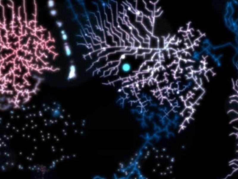 The piece combines a couple of algorithms that are competing to occupy the space: one that will look for the negative space and one that will try to connect the dots; the connecting algorithm is also clearly split into two sides with different approaches to the task at hand. How each new iteration of the algorithm is almost unpredictable yet explainable a posteriori: the rules of the underlying algorithms are actually pretty straightforward. Once the whole space has been explored, the battle begins and the frontline appears, sometimes complex and vibrant, sometimes spotty and vague – yet always present.