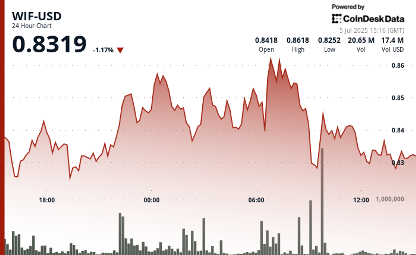 Dogwifhat (WIF) continues to draw attention amid volatile market conditions, with the token consolidating around $0.8319 after dipping 1.17% over the past 24 hours, according to CoinDesk Research’s technical analysis model. As for the greater memecoin section as gauged by the CoinDesk Memecoin Index(CDMEME), it is up 1.79% during the same period.
