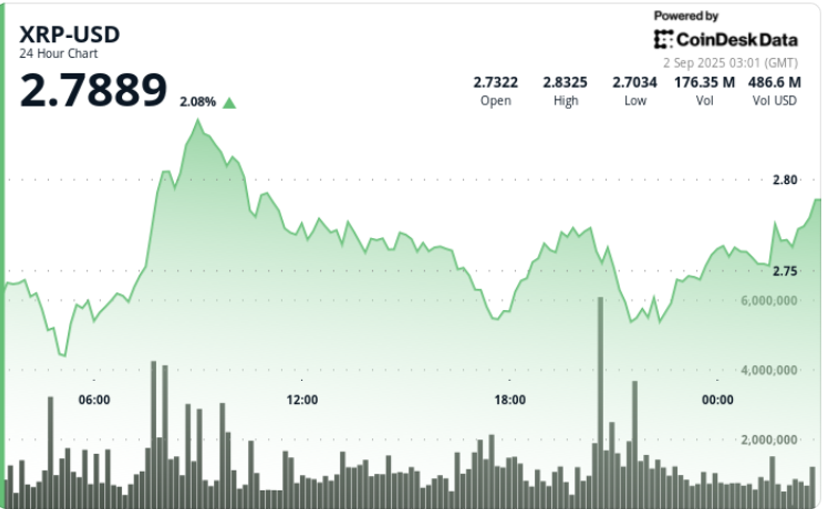 Window: Sept. 1, 14:00 → Sept. 2, 13:00 (24h).Range: $2.70–$2.83, about a 4% swing. Price tagged $2.71 around 21:00 before rebounding to highs near $2.83.Volume: Surged to 101.36M and 93.66M in bursts, compared with a 24h average of 65.49M. Weekly pace was about 19% higher than average.Levels: A base formed at $2.70–$2.72. Repeated rejection near $2.83 capped the upside. The session ended consolidating just under resistance.